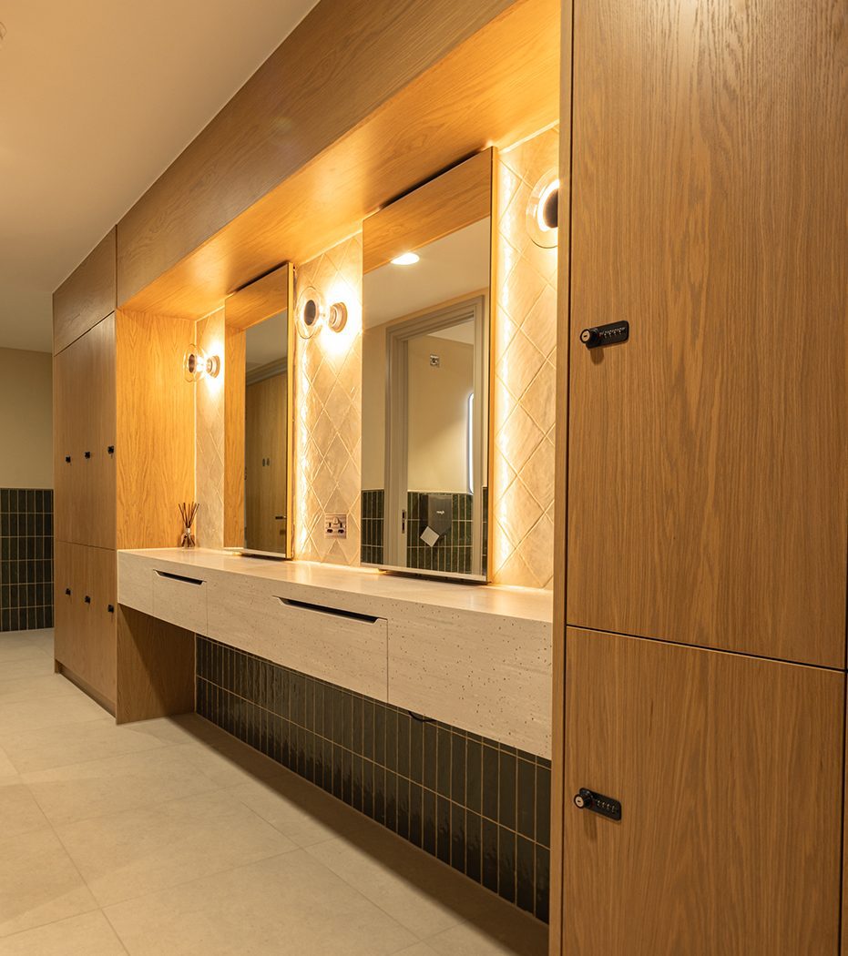 Joinery elements, including wall panelling, cupboards, banquette seating, teapoints and planters were designed to enhance the reception, communal areas, boardrooms and co-working spaces, combining style with practical functionality.