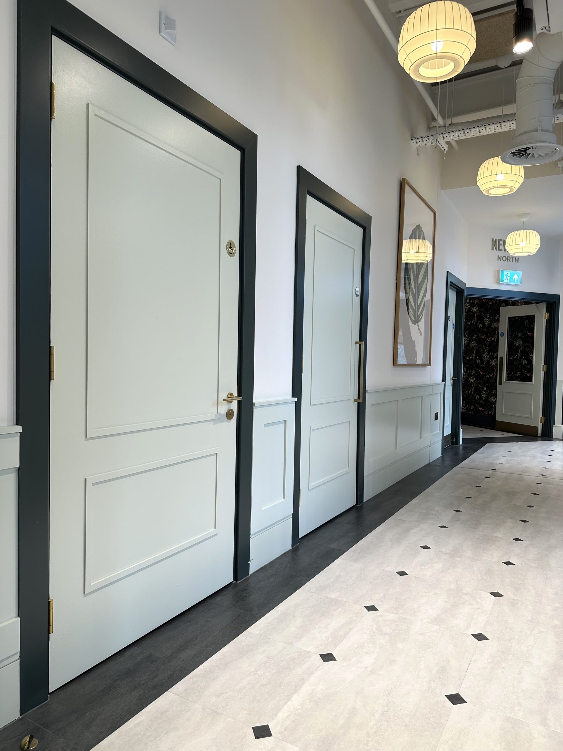 These elements included a reception desk complete with tiling and back-lit illuminated screens, dining kitchens fitted with high-end white goods, Class B fire-rated wall paneling, bespoke games room screens, and comprehensive firerated panel doorsets throughout the amenity spaces. Additionally, the project featured leather upholstered banquette seating, bespoke vanity units with mirrored walls and handrails, as well as a custom ceiling lattice system with integrated mirrors and wall arches designed for living plant displays.