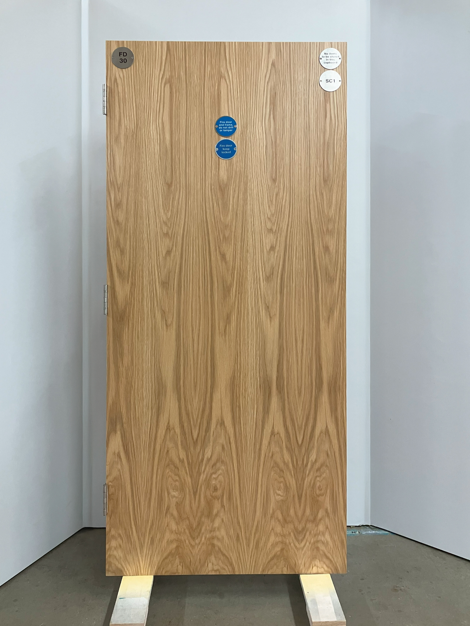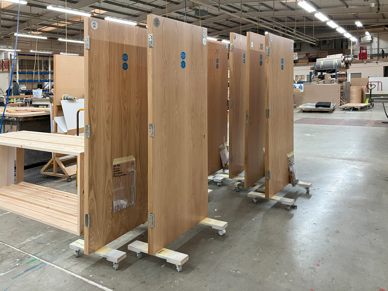 Internal fire door sets were manufactured with softwood frames and GDC door leaves, featuring hardwood lipping and a primed finish ready for on-site painting. Entrance doors were supplied in hardwood frames with clear lacquered Oak veneers and factory-applied Satin White finishes. Ironmongery options included electric strikes for access control and free swing closers linked to fire alarm systems.